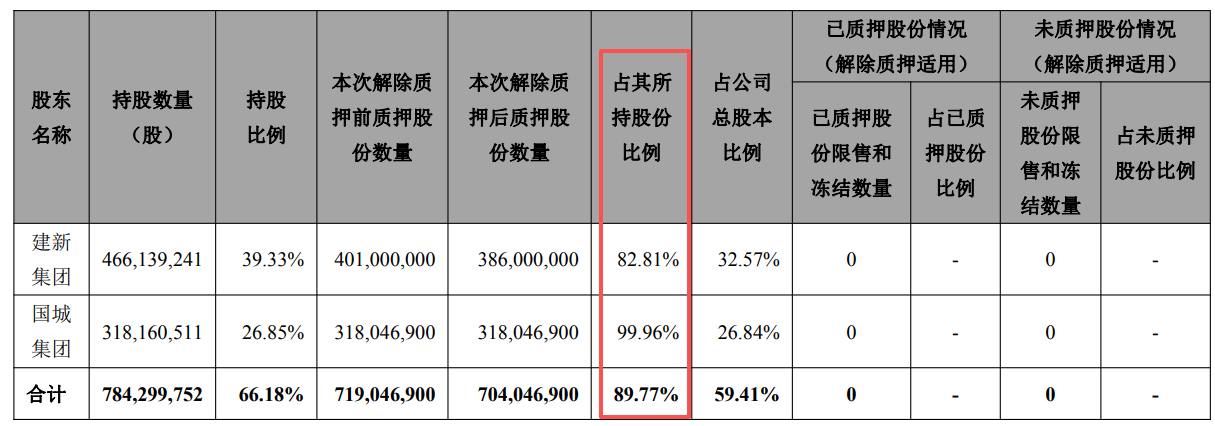 此外,国城矿业在公告中多次提示:控股股东国城集团及其一致行动人建新集团质押股份数量占其所持股份比例已超过80%。目前,建新集团质押股份数量占其所持股份比例为82.81%,而国城集团质押股份数量占其所持股份比例达99.96%。