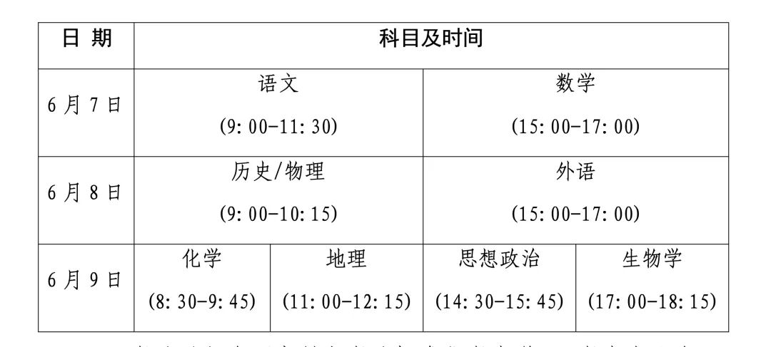 全国统考和选择性考试于 6 月 7、8、9 日举行,具体安排 如下:
