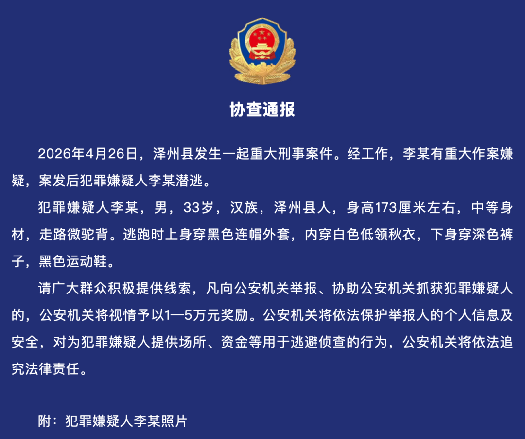 2026年4月26日,泽州县发生一起重大刑事案件。经工作,李某有重大作案嫌疑,案发后犯罪嫌疑人李某潜逃。