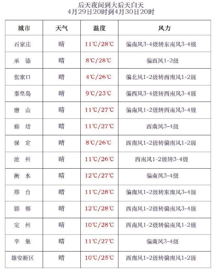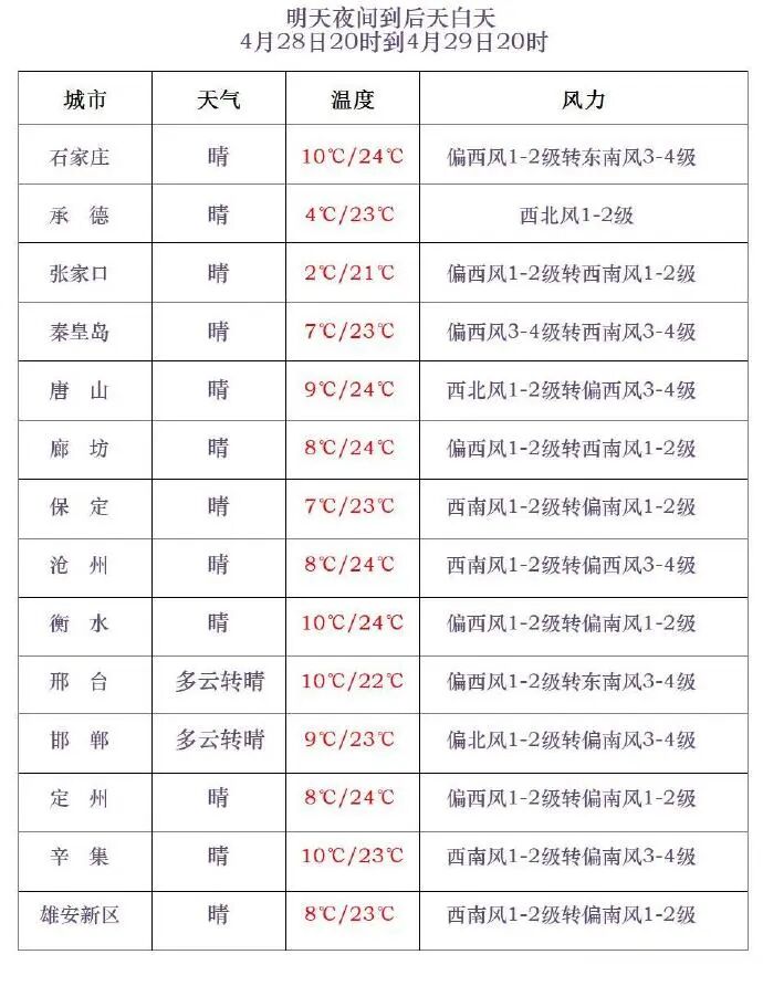 明天夜间到29日,石家庄、沧州以南地区多云转晴,其他地区晴间多云。