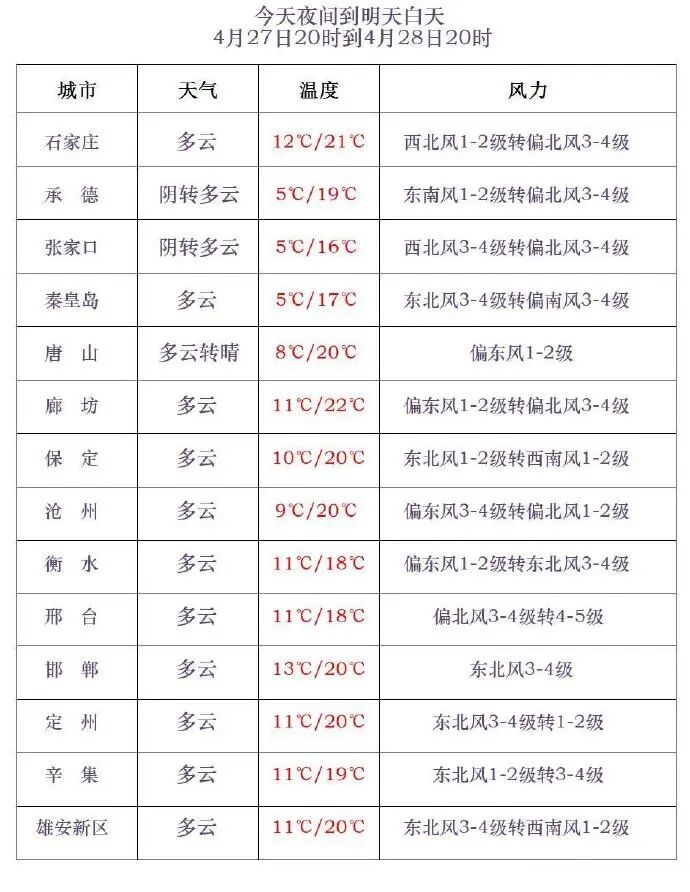 预计27日傍晚到28日白天,张家口、承德、唐山北部、秦皇岛北部、保定西部、石家庄西部、邢台、邯郸有偏北风4到5级,阵风6到7级,局地可达8级。27日傍晚,廊坊东部、沧州东部及其沿岸海域有偏北风4到5级,阵风6到7级,局地可达8级。请注意防范。