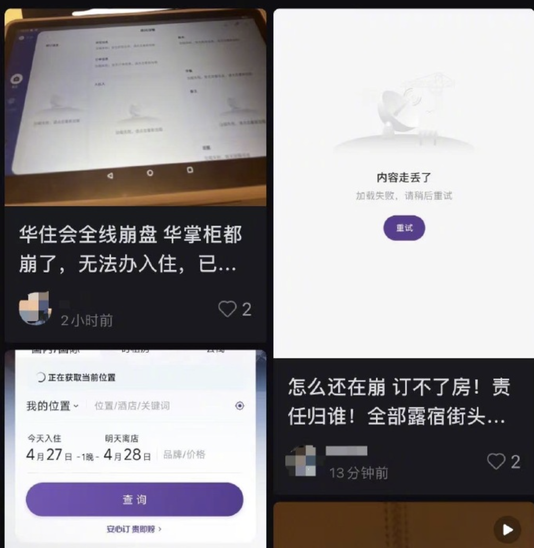 多位用户发帖称华住会APP持续显示“加载失败”或登录失败,即使尝试更新应用、重启手机也无解;前台系统同步崩溃,无法办理入住、续房等操作。