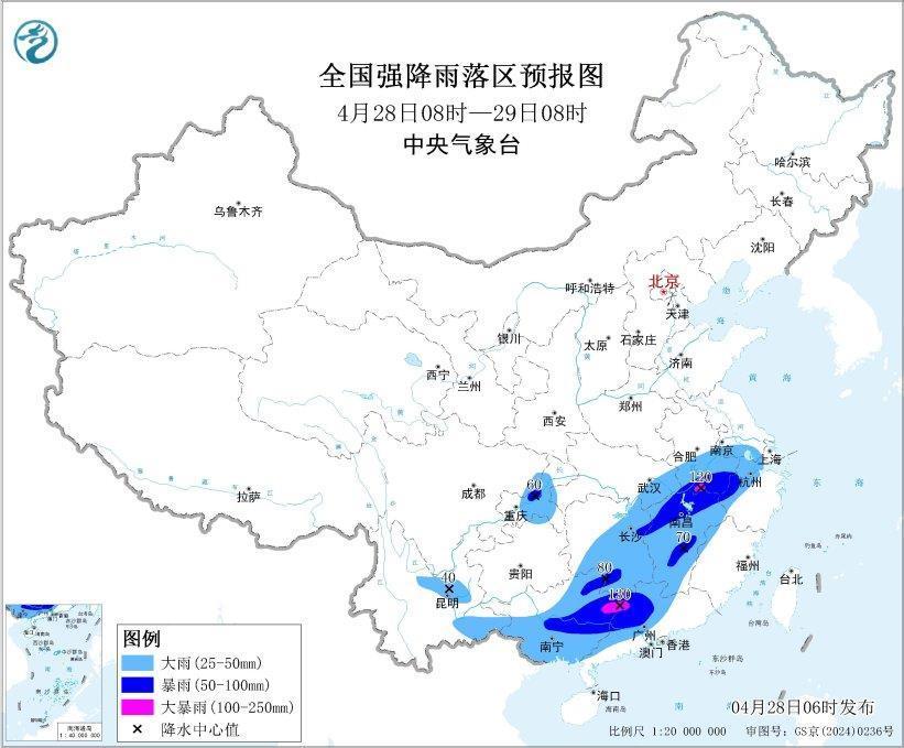 ▷中央气象台今日6时继续发布强对流天气蓝色预警和暴雨黄色预警,预计,4月28日8时至29日8时,重庆中部、云南东部、江淮南部、江南中西部、华南中西部等地部分地区有大到暴雨。详情>>