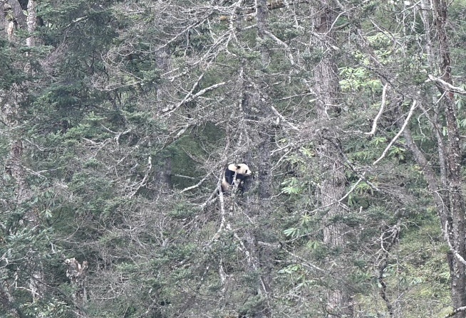 在连续进行10余天的野外调查后,4月7日当天中午12点左右,唐家河巡护员杨邦富在海拔2630米位置,发现野生大熊猫在一棵红桦树上停留了几十秒,随后下树隐入竹林。当天大雾且有零星小雨,可见度较低,但大熊猫的叫声格外清晰。