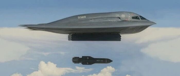 ▲美军B-2隐身轰炸机投掷GBU-57巨型钻地弹