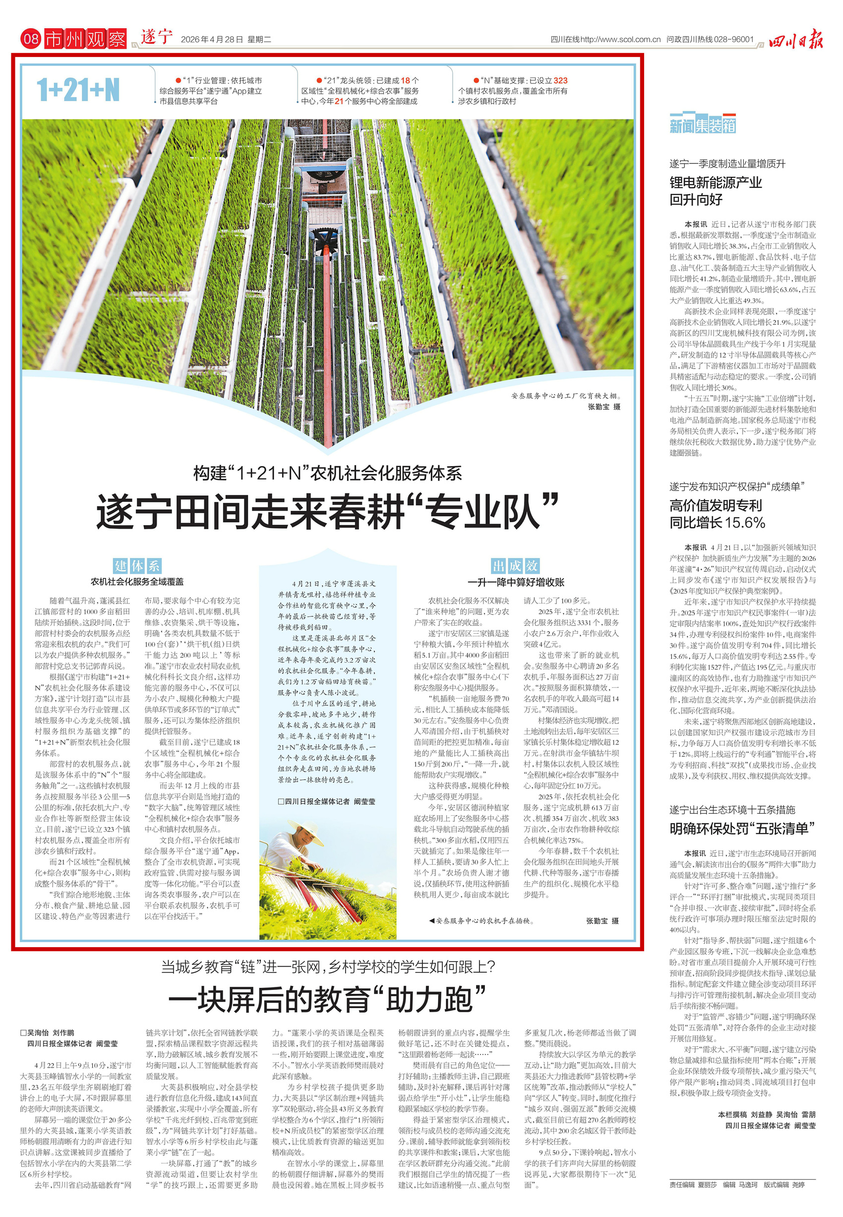 2025年,依托农机社会化服务,遂宁完成机耕613万亩次、机播354万亩次、机收383万亩次,全市农作物耕种收综合机械化率达75%。