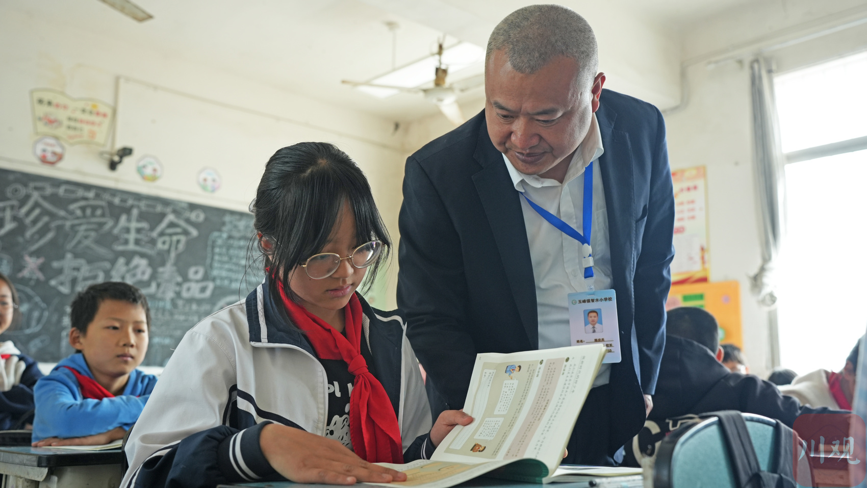 智水小学校长陈应兵在了解孩子们的上课情况。刘作鹏摄