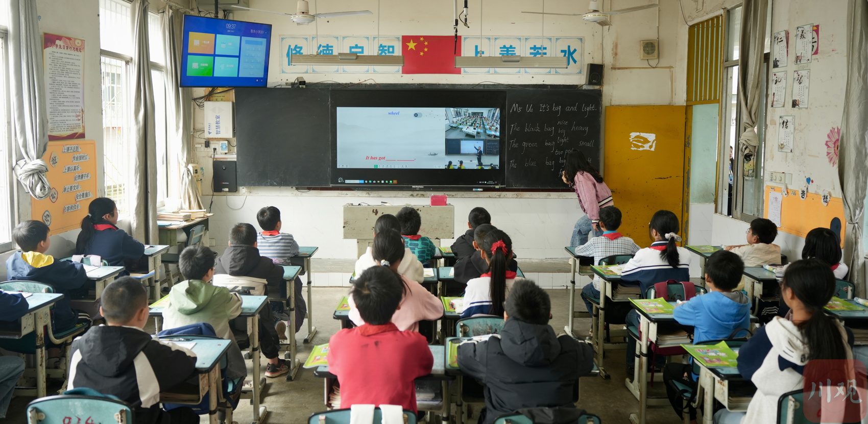 屏幕另一端的课堂位于20多公里外的大英县城,蓬莱小学英语教师杨朝霞用清晰有力的声音进行知识点讲解。这堂课被同步直播给了包括智水小学在内的大英县第二学区6所乡村学校。