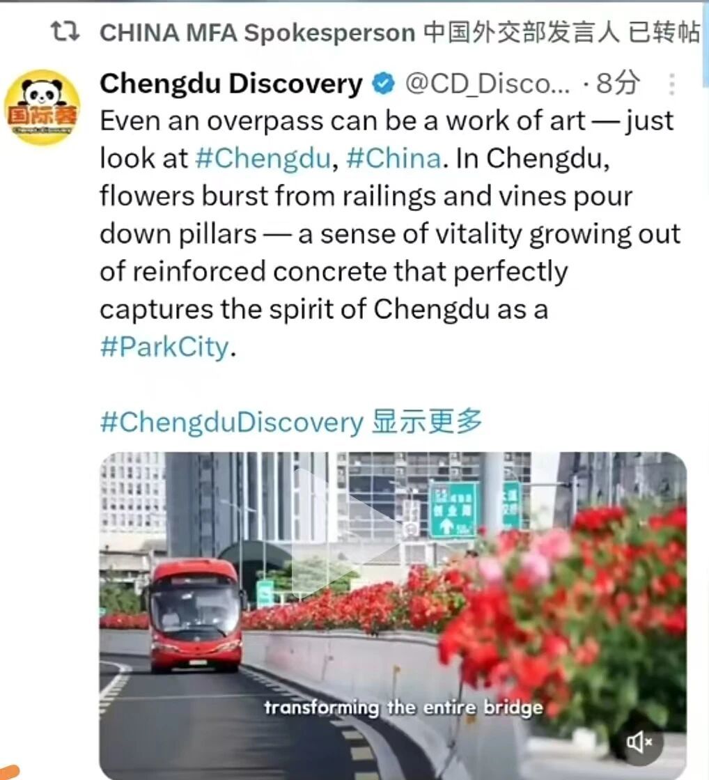 继上月转发推荐成都天府国际生物城落樱缤纷的盛景之后,4月27日,中国外交部发言人海外账号再次转发分享成都高新区的“春日美景”——成都二环高架“空中花路”。当镜头掠过成都高新区永丰立交,串联起二环高架上的春日花景。钢筋水泥之上,繁花盛开,绿意如瀑,勾勒出公园城市的浪漫。