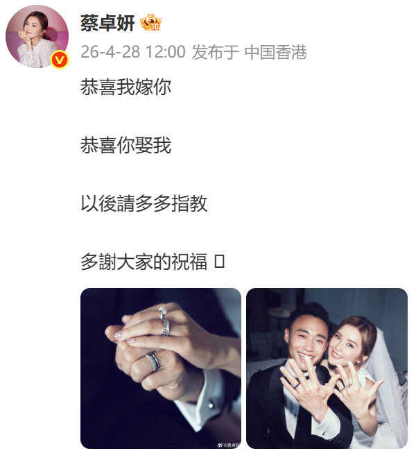 4月28日,蔡卓妍在社交平台宣布结婚,她晒出结婚照并配文:“恭喜我嫁你,恭喜你娶我,以后请多多指教,多谢大家的祝福。”