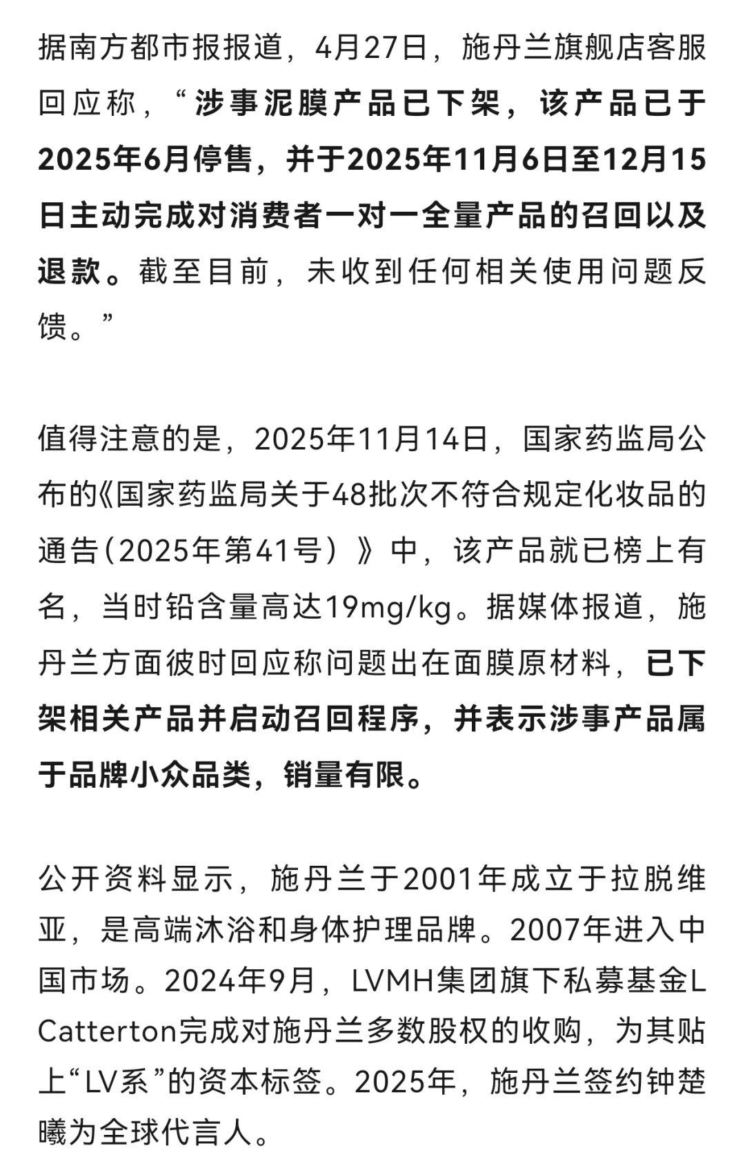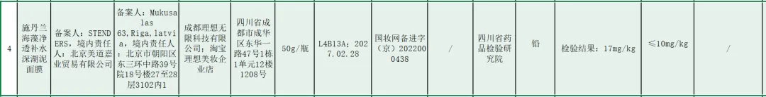近日,四川省药品监督管理局通报16批次不符合规定的化妆品,其中“施丹兰海藻净透补水深湖泥面膜”(备案号:国妆网备进字(京)2022000438)因铅含量超标被点名。