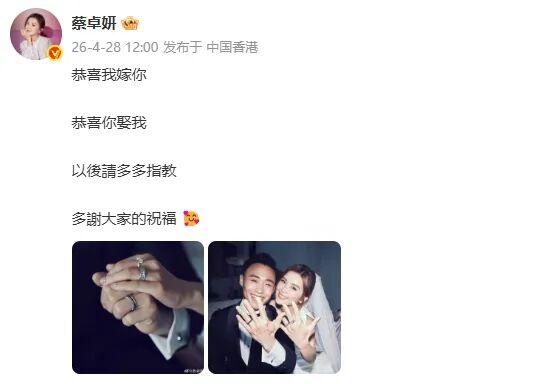 4月28日12时,知名演员、歌手蔡卓妍(阿sa)通过微博宣布结婚。