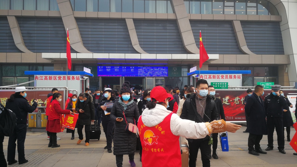 随着G2885次列车上的旅客陆续出站,出站口两侧的志愿者们热情地为旅客送上福袋和春联,并主动为他们搬运行李,医护人员也送上内江市中医医院特制的预防新冠肺炎中药汤剂。
