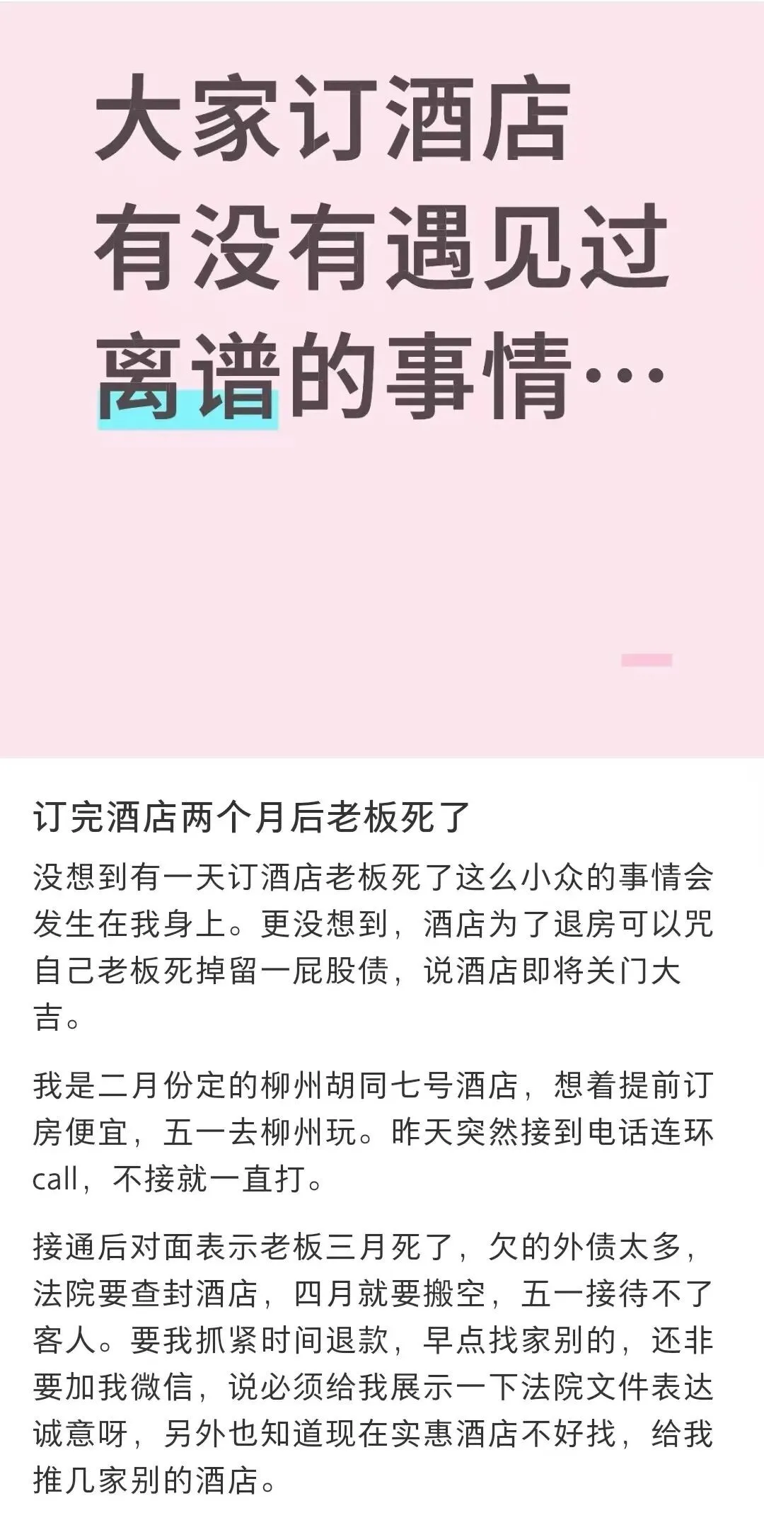 提前两个月低价预订五一酒店,临近出行却被商家以“老板离世、门店将查封”等离谱理由要求退房。