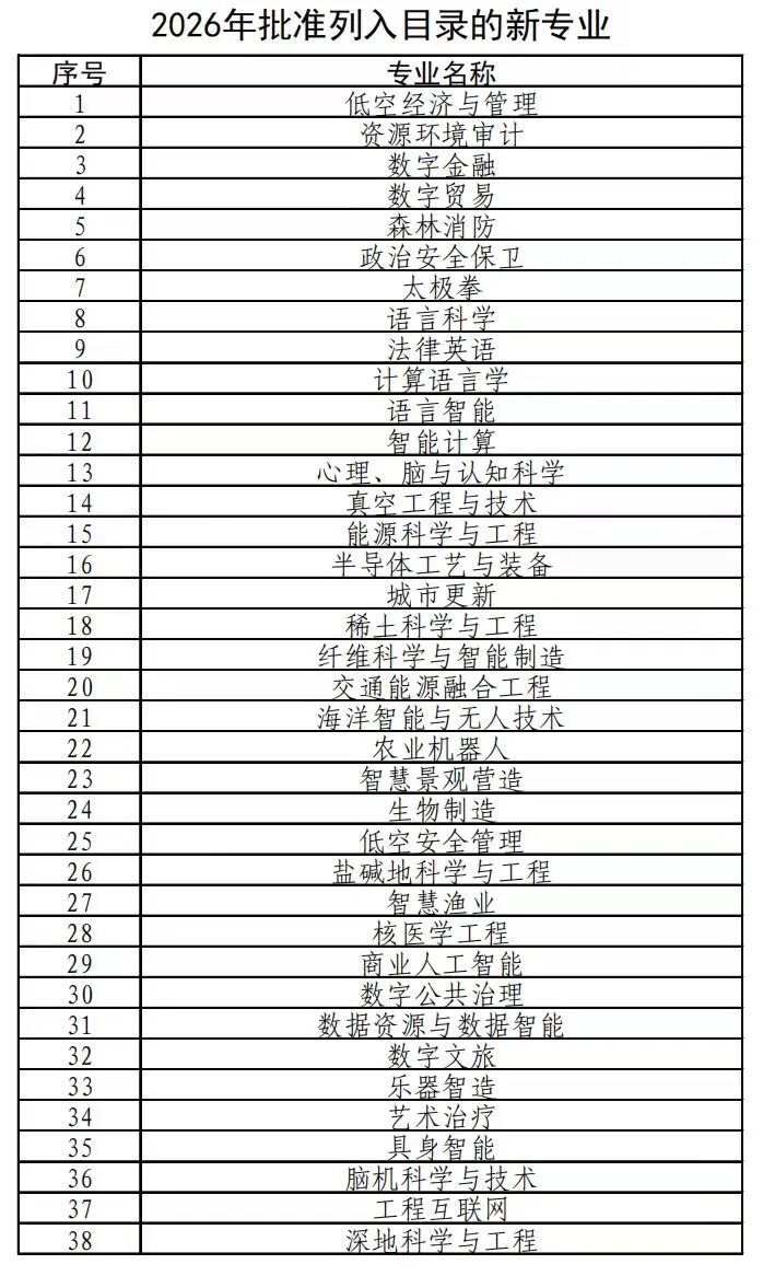 教育部今天(28日)发布《普通高等学校本科专业目录(2026年)》,共新增38种普通高校本科新专业。本次获批申办高校可纳入2026年高考招生。