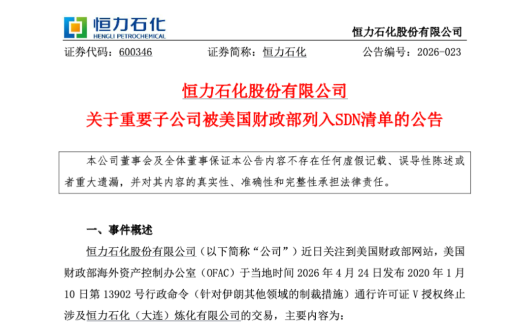 恒力石化强调,美国财政部此次将恒力炼化列入SDN清单的决定缺乏事实与法律依据,系单边制裁行为。公司坚决反对这种无视事实、违背国际经贸规则的无端指控与非法单边制裁,并将依法采取一切必要措施,维护公司及股东的合法权益。