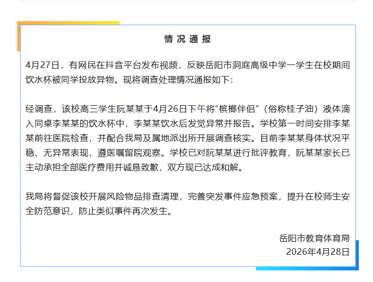 4月27日,有网民在抖音平台发布视频,反映岳阳市洞庭高级中学一学生在校期间饮水杯被同学投放异物。现将调查处理情况通报如下: