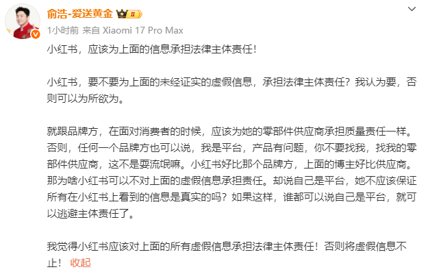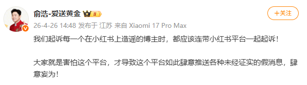 发表上述言论不久后,俞浩再次发文,进一步升级批评力度,还提出了法律层面的主张:“我们起诉每一个在小红书上造谣的博主时,都应该连带小红书平台一起起诉!”