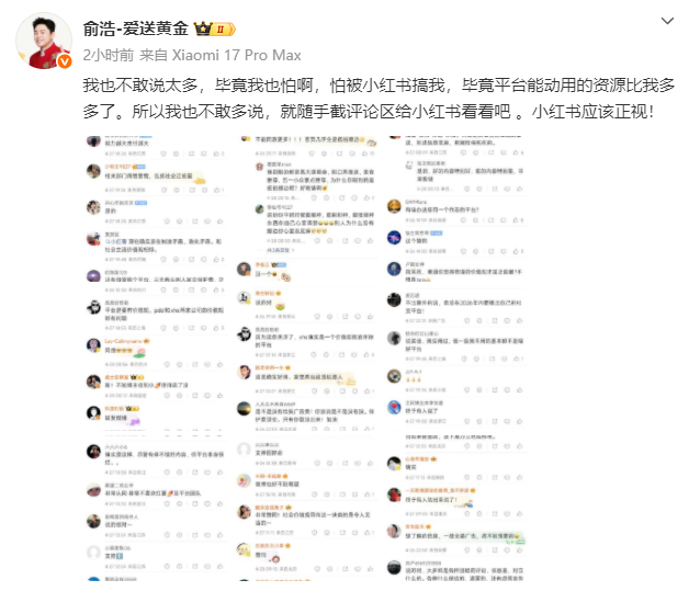 随后又补充道:“我也不敢说太多,毕竟我也怕啊,怕被小红书搞我,毕竟平台能动用的资源比我多多了,所以我也不敢多说,就随手截评论区给小红书看看吧。”