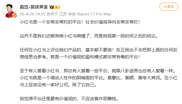 4月26日,追觅科技创始人兼 CEO 俞浩在社交媒体发文,对小红书平台表达了批评。