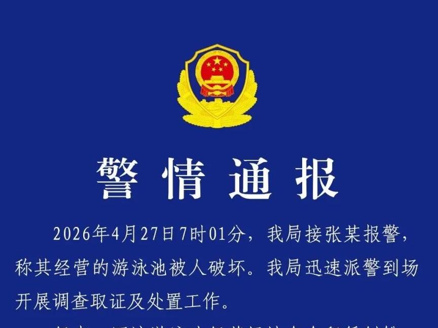4月28日,成都市公安局青羊区分局发布警情通报称,4月27日7时01分,警方接张某报警,称其经营的游泳池被人破坏。警方迅速派警到场开展调查取证及处置工作。