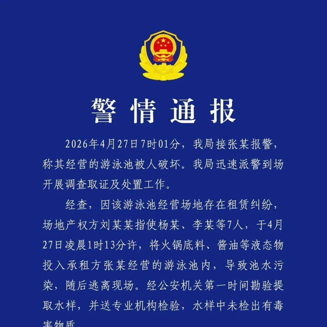 经查,因该游泳池经营场地存在租赁纠纷,场地产权方刘某某指使杨某、李某等7人,于4月27日凌晨1时13分许,将火锅底料、酱油等液态物投入承租方张某经营的游泳池内,导致池水污染,随后逃离现场。经公安机关第一时间勘验提取水样,并送专业机构检验,水样中未检出有毒害物质。