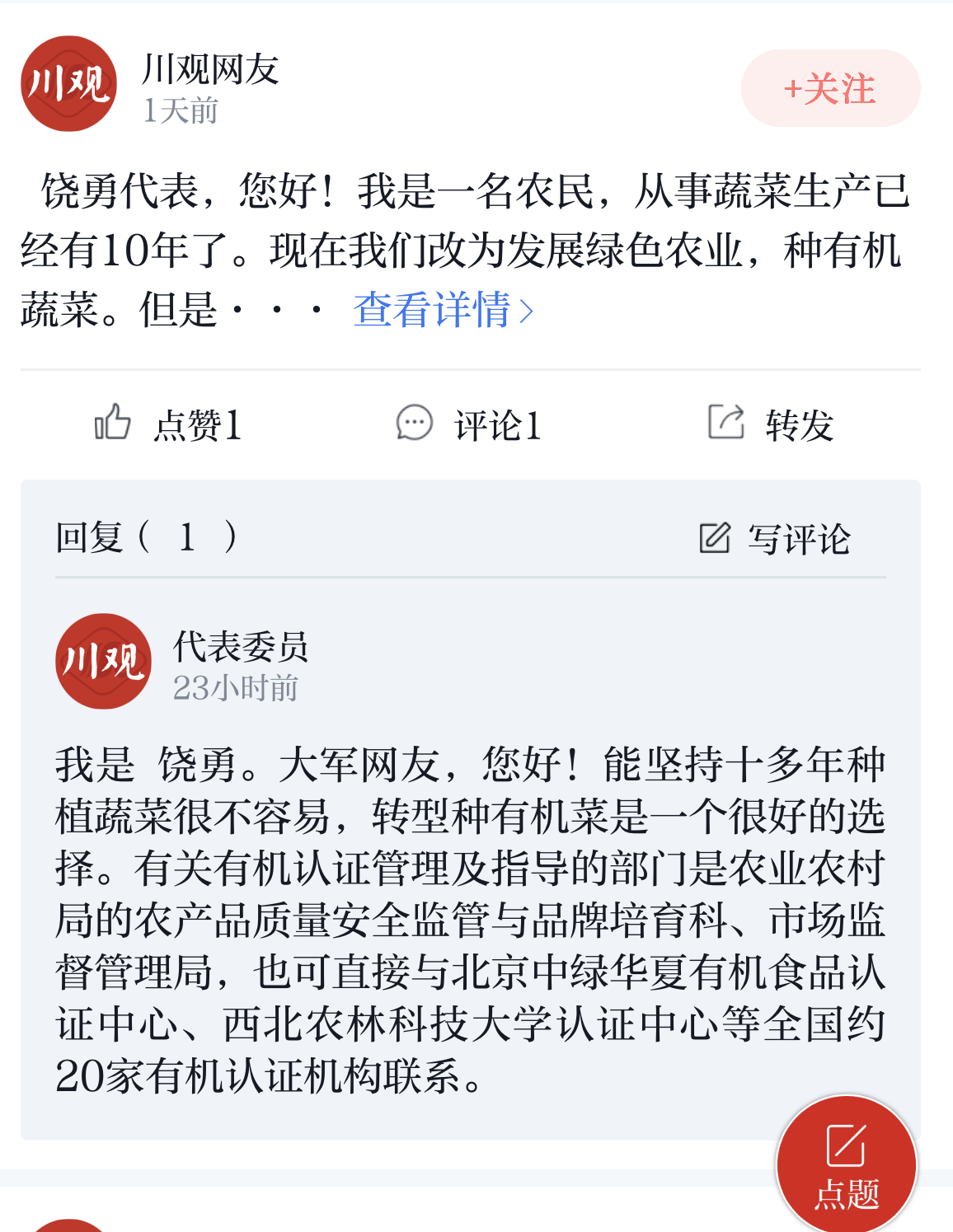 网友“张大军”是一名农民,从事蔬菜生产已经有10年了,现在改种有机蔬菜。他求助省两会的代表委员,“面对种植过程中遇到的技术难题,我们也想有相关的农业专家能提供一对一的专业意见,应该给哪个部门或机构对接呢?”