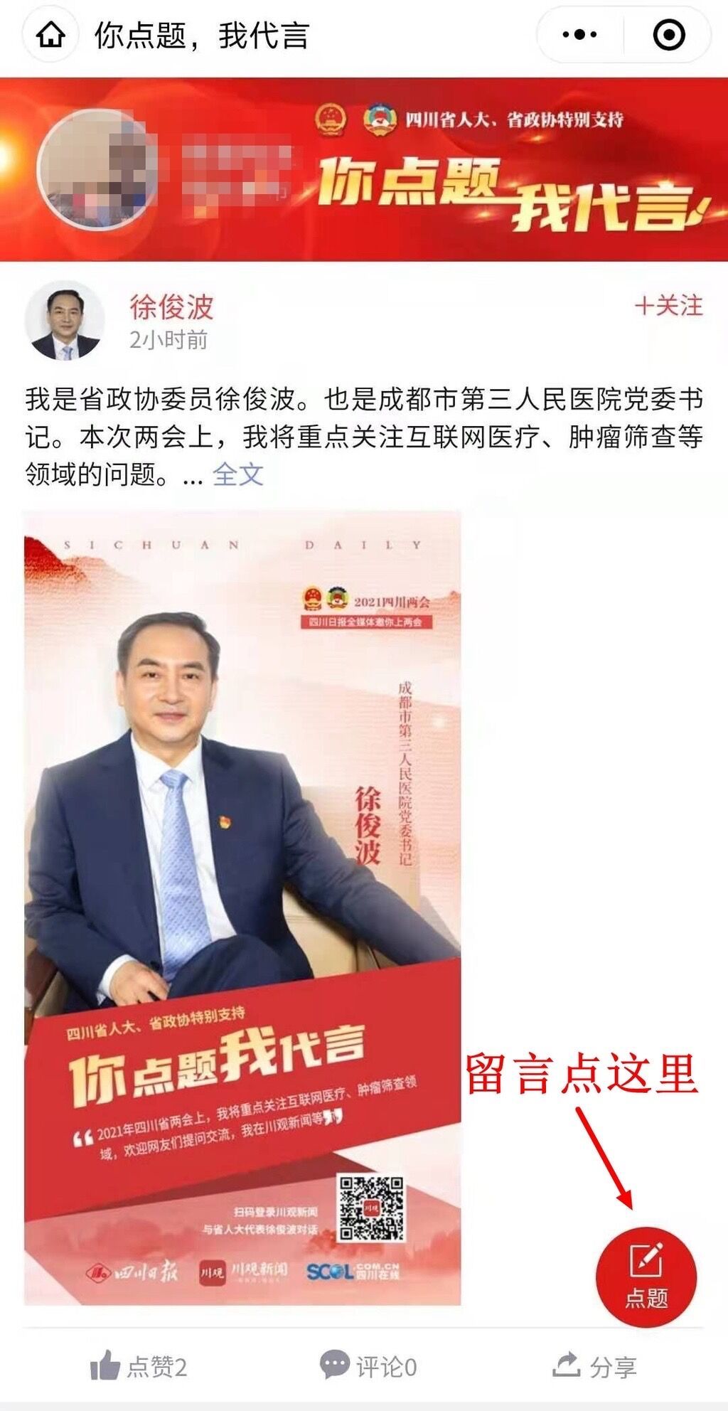 方式三:点击四川在线“你点题,我代言——四川日报全媒体邀您‘上两会’ 代表委员为你代言”活动链接(点这里<<<)或网址进行留言:https://topic.scol.com.cn/2021/21bxdt/