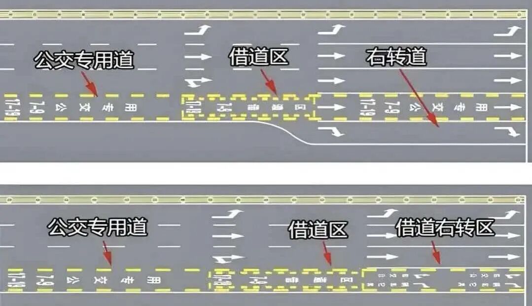 此外,对于公交专用道借道区的使用,此次优化调整进行了重申和强调,转弯车辆可通过公交专用道施划的借道区标线进出道路,行经该区域时应迅速驶离,不应在该区域停车;非转弯车辆不应使用借道区。