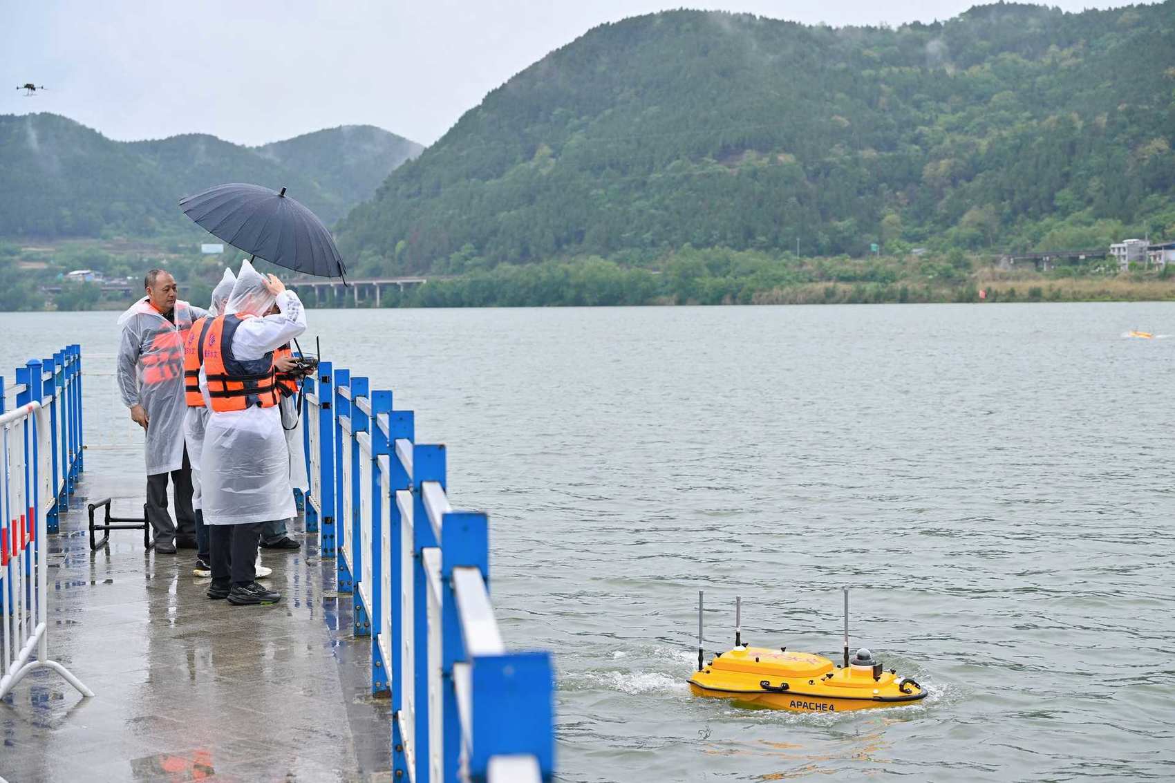 涪江干流射洪城区水文应急测报演练现场,应急队员利用车载相控阵水利测雨雷达开展应急测报区域面雨量监测,同时利用一体化自动雨量水位计、侧扫雷达测流设备等高精度监测设备,开展雨量水位测报、河道测流等多个科目的演练。此外,还开展了无人船测流、无人机测流、河段地形测绘、应急通信保障等多个科目的演练。