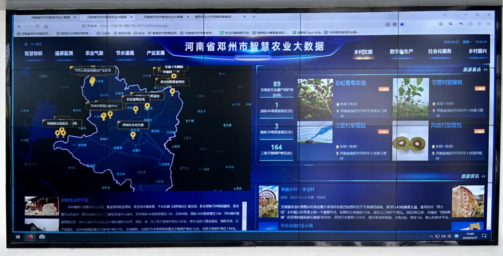 4月27日,河南省邓州市文渠镇李洼村,邓州市智慧农业中心内,一面大屏正在实时刷新麦田数据。工作人员点开一处地块,土壤墒情、气象变化、作物长势等信息随即呈现。
