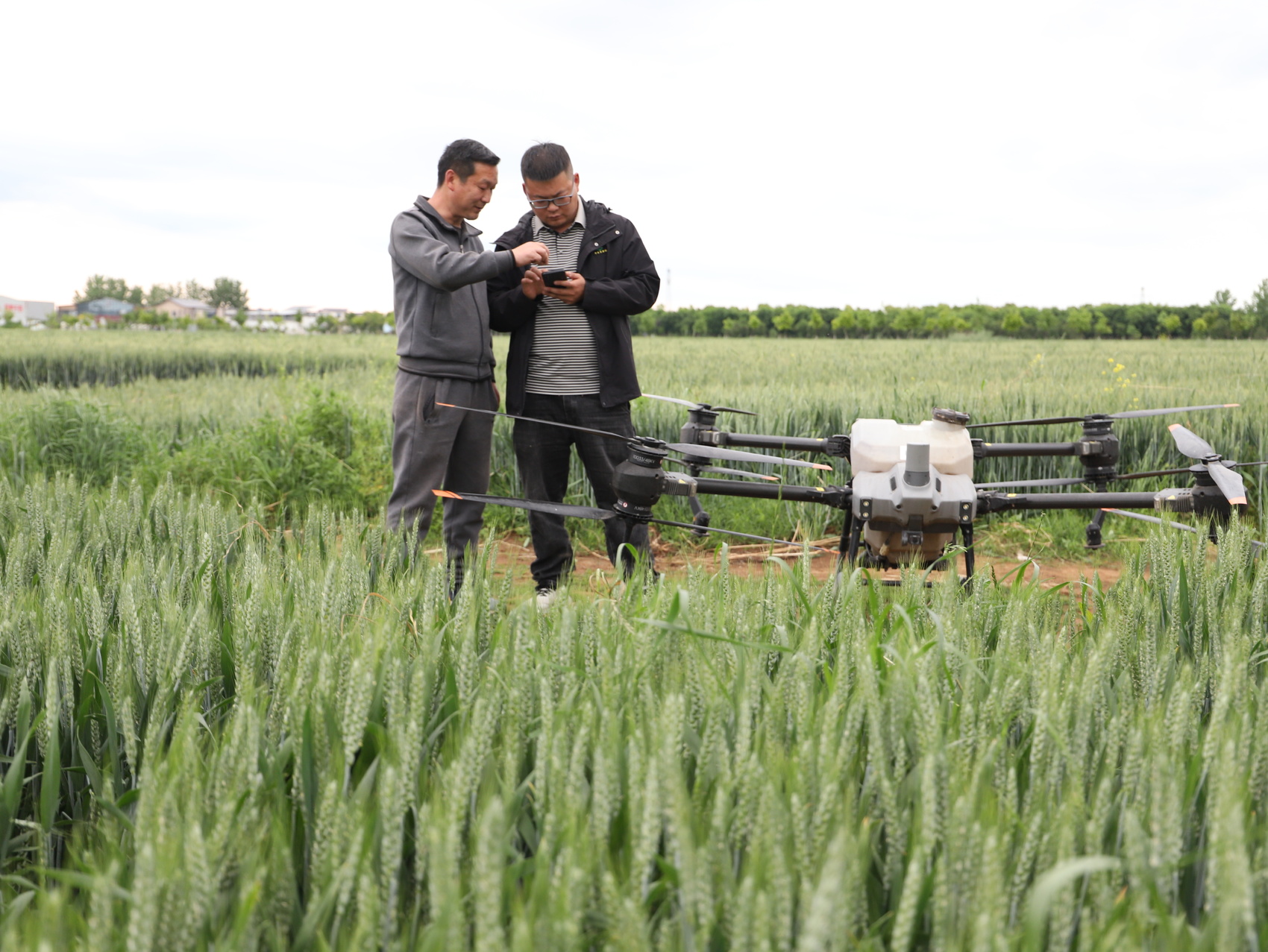 李占(左)在指导段傲笛(右)根据农事指导意见使用无人机对小麦赤霉病开展补防。受访者供图