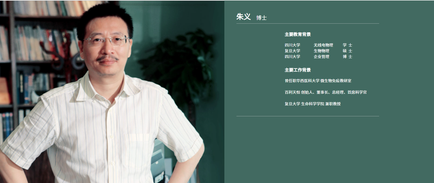 朱义1963年出生于四川,毕业于四川大学无线电物理专业,曾于华西医科大学担任微生物与免疫学教师。1996年,他回到成都温江创办了百利药业。