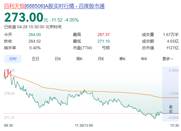 截至4月28日收盘,百利天恒跌4.05%,报273元/股,总市值为1127亿元。