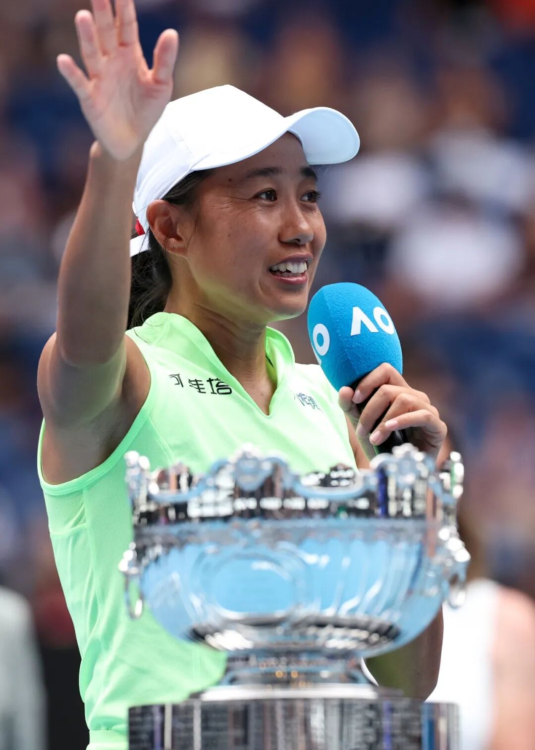 2026年1月31日,张帅在澳网女双颁奖仪式上发言。新华社发