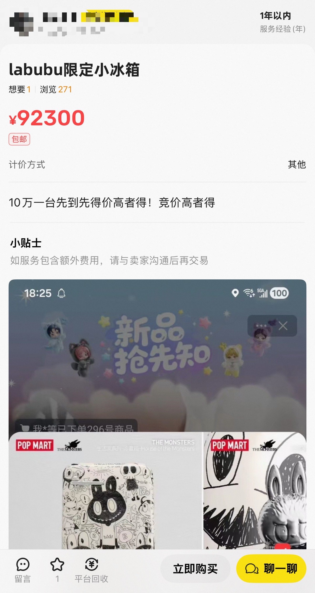 LABUBU冰箱挂出9.23万元高价。图据某二手交易平台