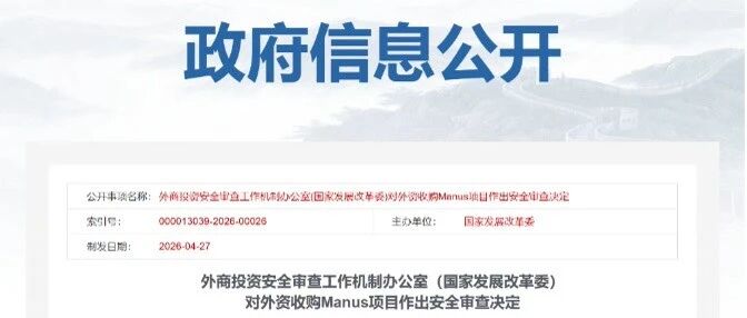 4月27日,备受各方关注的Manus并购案靴子落地,中国外商投资安全审查工作机制办公室(国家发展改革委)依法依规对外资收购Manus项目作出禁止投资决定,要求当事人撤销该收购交易。