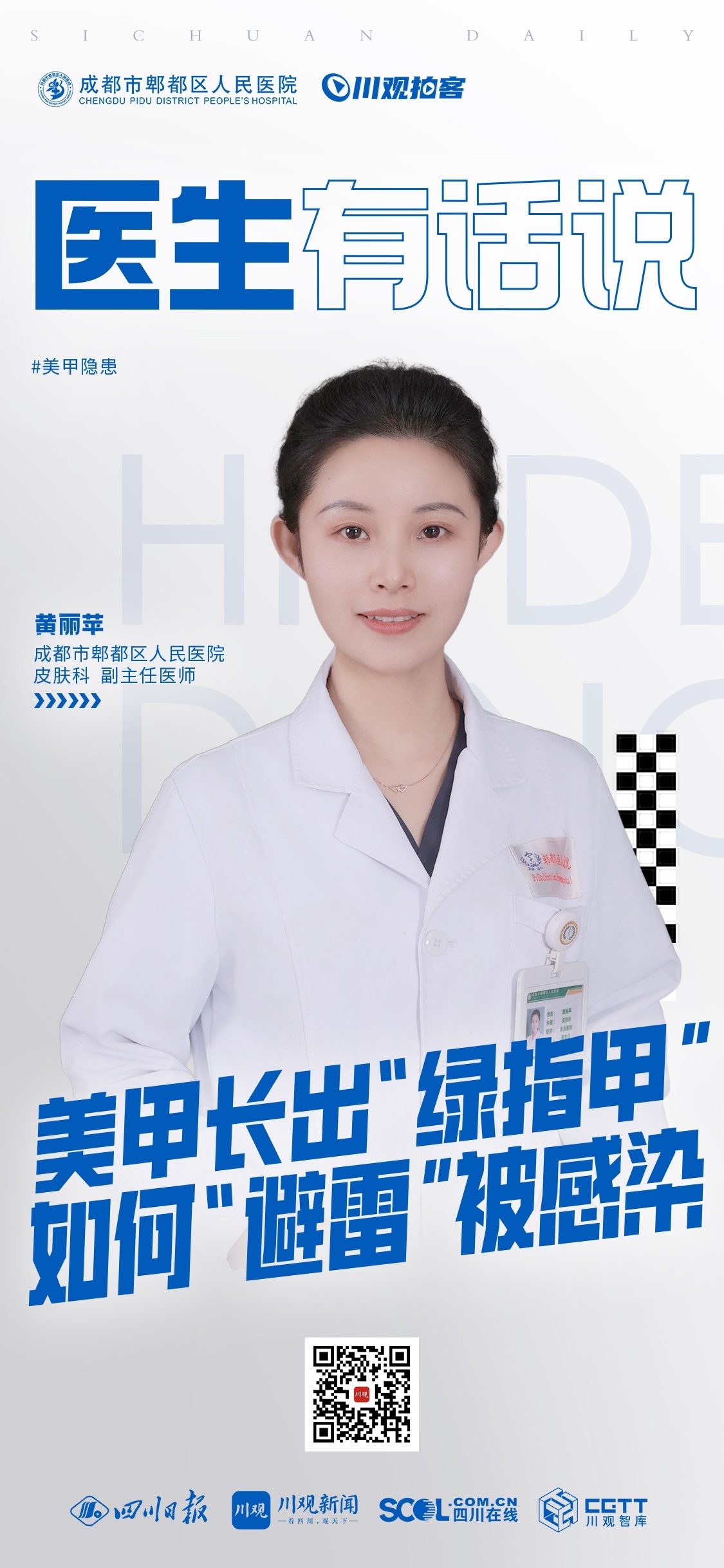 本期栏目,来自成都市郫都区人民医院皮肤科的副主任医师黄丽苹,跟大家说一说美甲可能带来哪些健康隐患,哪些人群不建议做美甲,以及如何健康美甲。