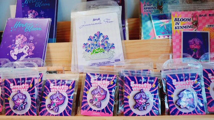 四月春深,昆明教场中路的蓝花楹如期绽放。如今,这份紫色浪漫不再只停留在枝头——它被“装”进许愿瓶、别上帆布包、定格成冰箱贴,成为爱花者可带走的“城市记忆”。
