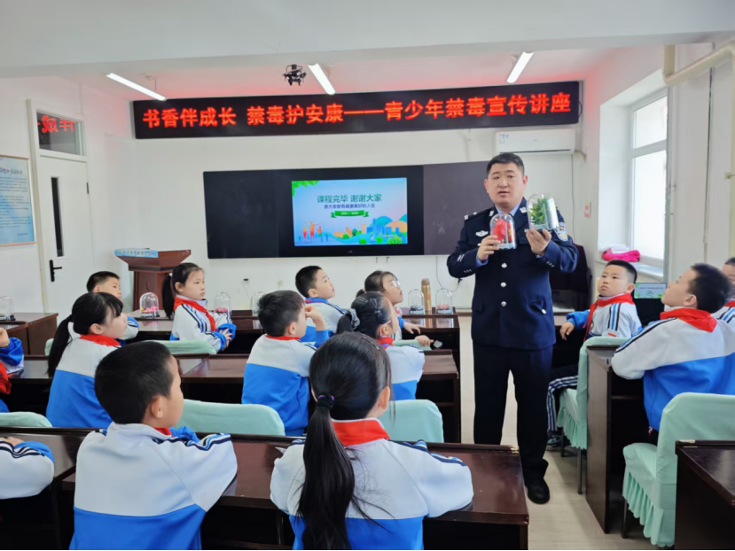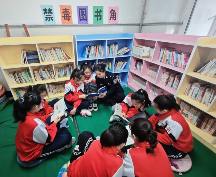 在桥南小学的禁毒图书角,禁毒民警把仿真模型一字排开,瞬间吸引了孩子们的目光。“这是什么?它伪装成什么?”民警抛出一个个问题,孩子们争相举手抢答,在欢声笑语中学会了识别“跳跳糖”“邮票”“聪明药”等陷阱。随后,禁毒民警拿出彩纸、彩笔和画纸,带着孩子们制作禁毒主题手抄报。有的画了“拒绝毒品”的拳头,有的写了“健康人生”的标语,一幅幅手抄报被张贴在图书角的展示墙上,成为最生动的禁毒宣传画。老师笑着说:“图书角本来就有很多禁毒绘本,现在又多了孩子们亲手做的手抄报,这里成了课间最热闹的‘安全小驿站’。”