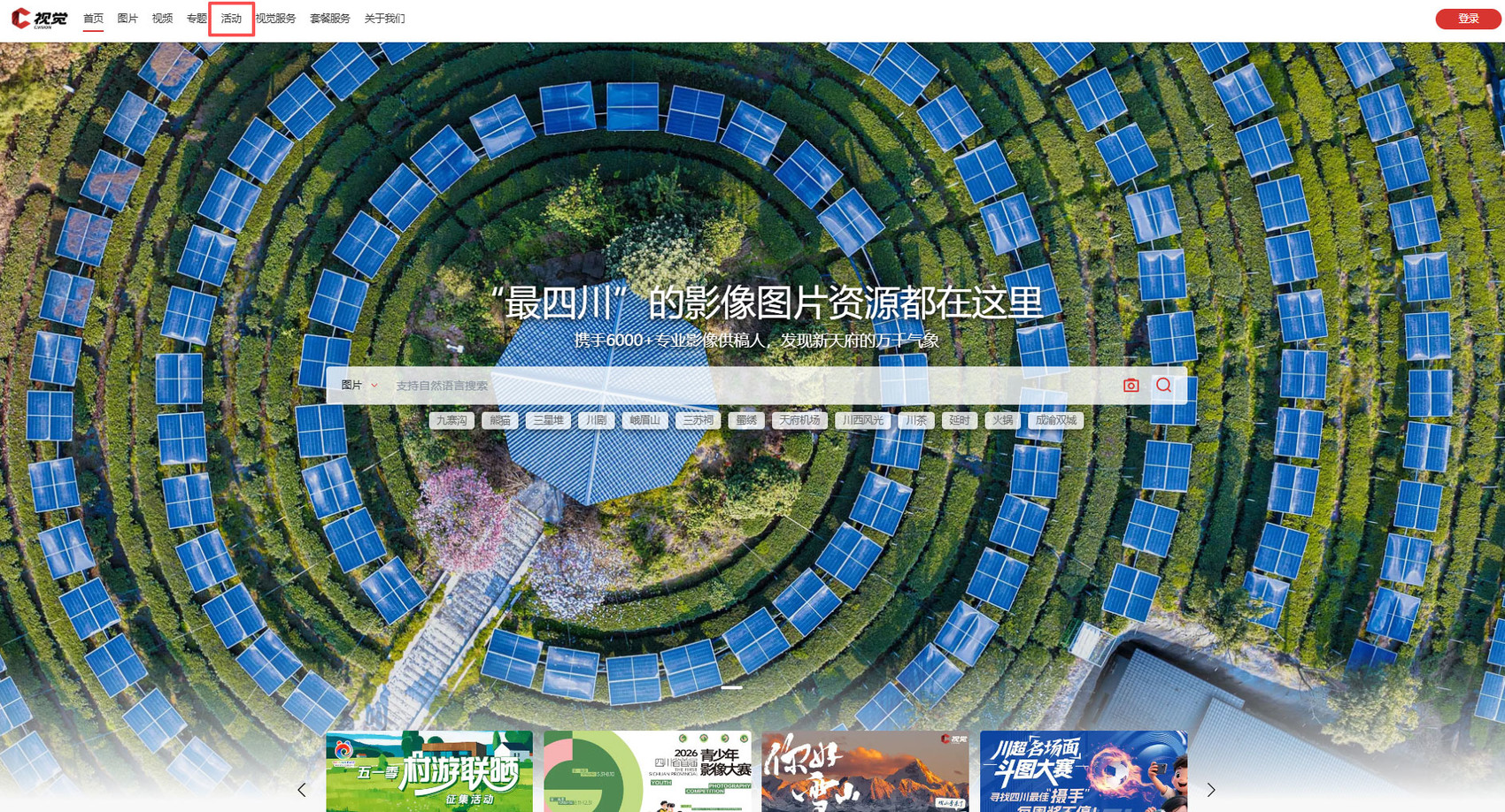 第一步:登录C视觉官网,登录已签约供稿人账号,在官网首页顶部的”导航栏,点击“活动”频道。