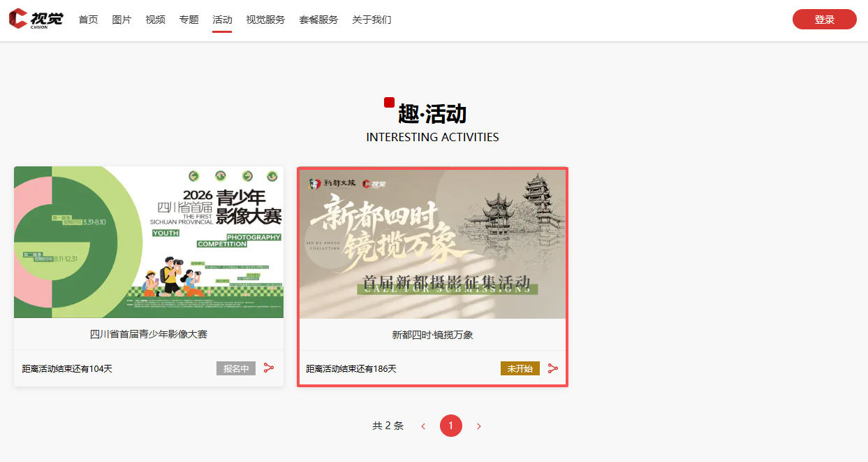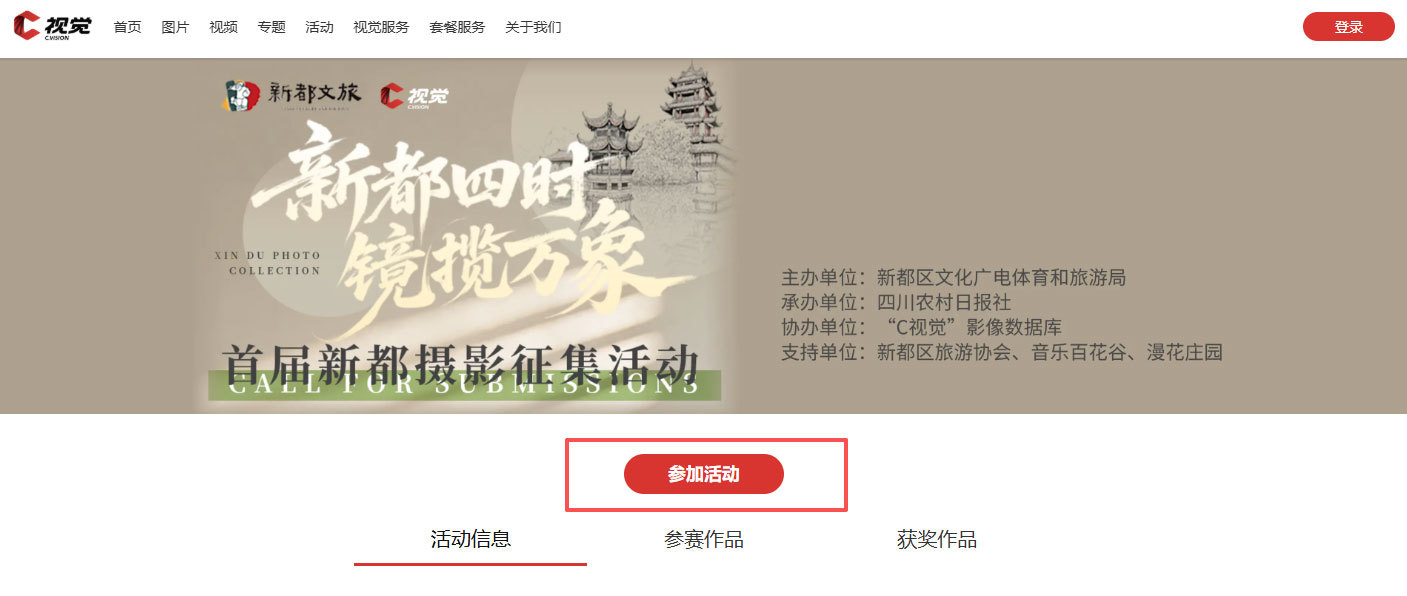 2、打开并登录C视觉官网,在导航栏点击并打开“活动”频道,进入【新都四时·镜揽万象】征集专辑中,点击“参加活动”按钮即可投稿。