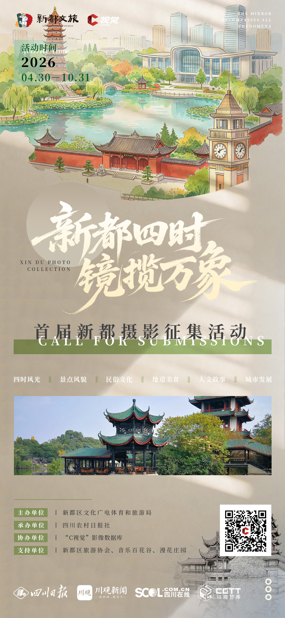 本次摄影征集紧扣香城宝地・古蜀新都品牌塑造,深度挖掘新都区优质文旅资源,围绕四时风光、景点风貌、民俗文化、地道美食、人文故事、城市发展六大核心维度,重点发现、记录与展示新都区文商旅体融合发展的新场景、新业态、新面貌。