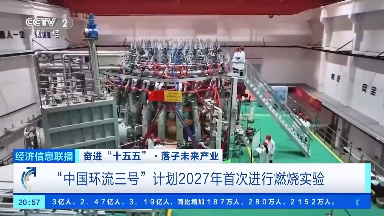 “中国环流三号”作为我国“新一代人造太阳”装置,实现了离子温度1.2亿摄氏度、电子温度1.6亿摄氏度的“双亿度”,聚变综合参数达到10的20次方量级。当前,“中国环流三号”正按计划推进全面升级,计划2027年首次实现燃烧实验。