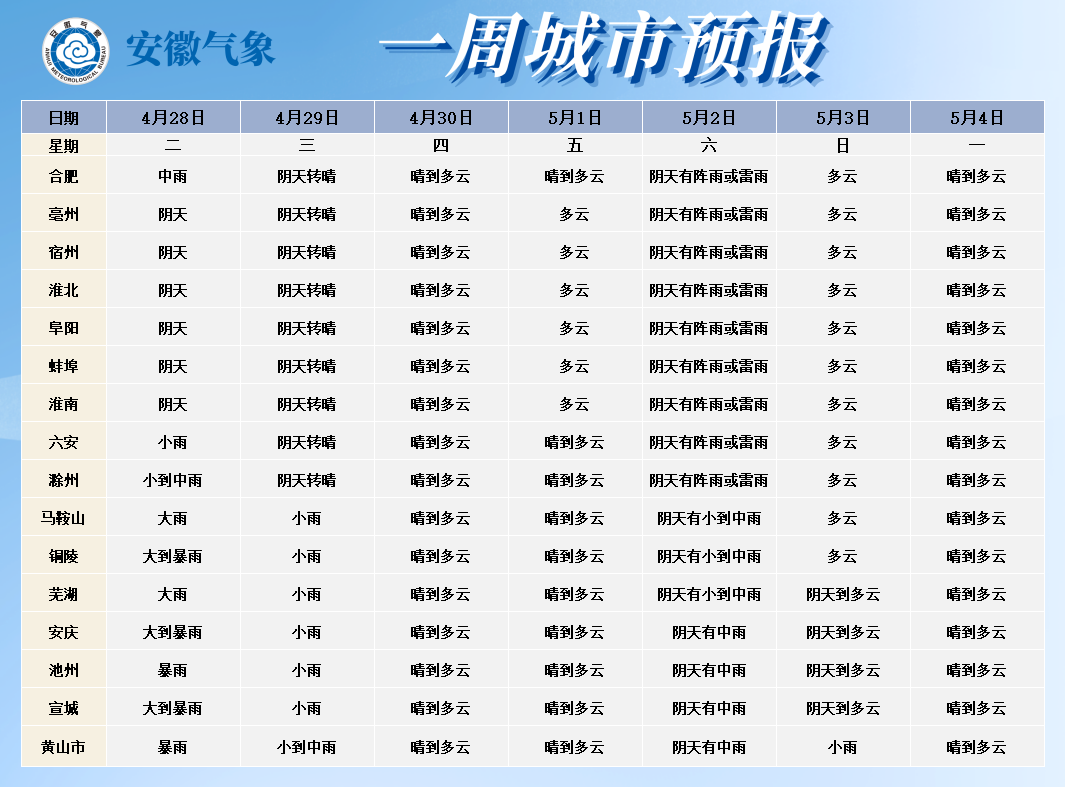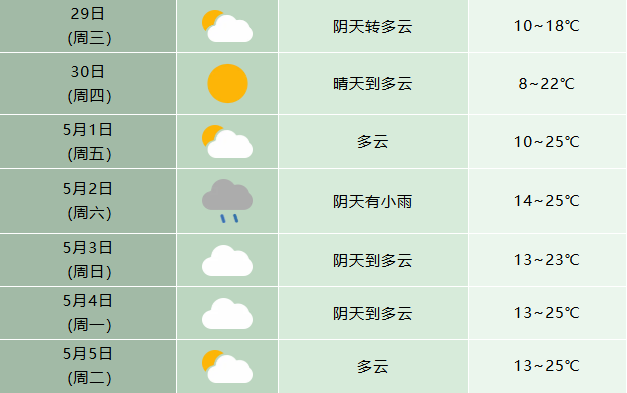 29日:江北阴天转晴天;沿江江南阴天转多云有小雨,局部中雨。30日和5月1日:全省晴到多云。2日:全省阴天有阵雨或雷雨,其中大别山区和沿江江南部分地区中雨。3日:江北多云;江南阴天到多云,部分地区有小雨。4日至7日:全省晴到多云。