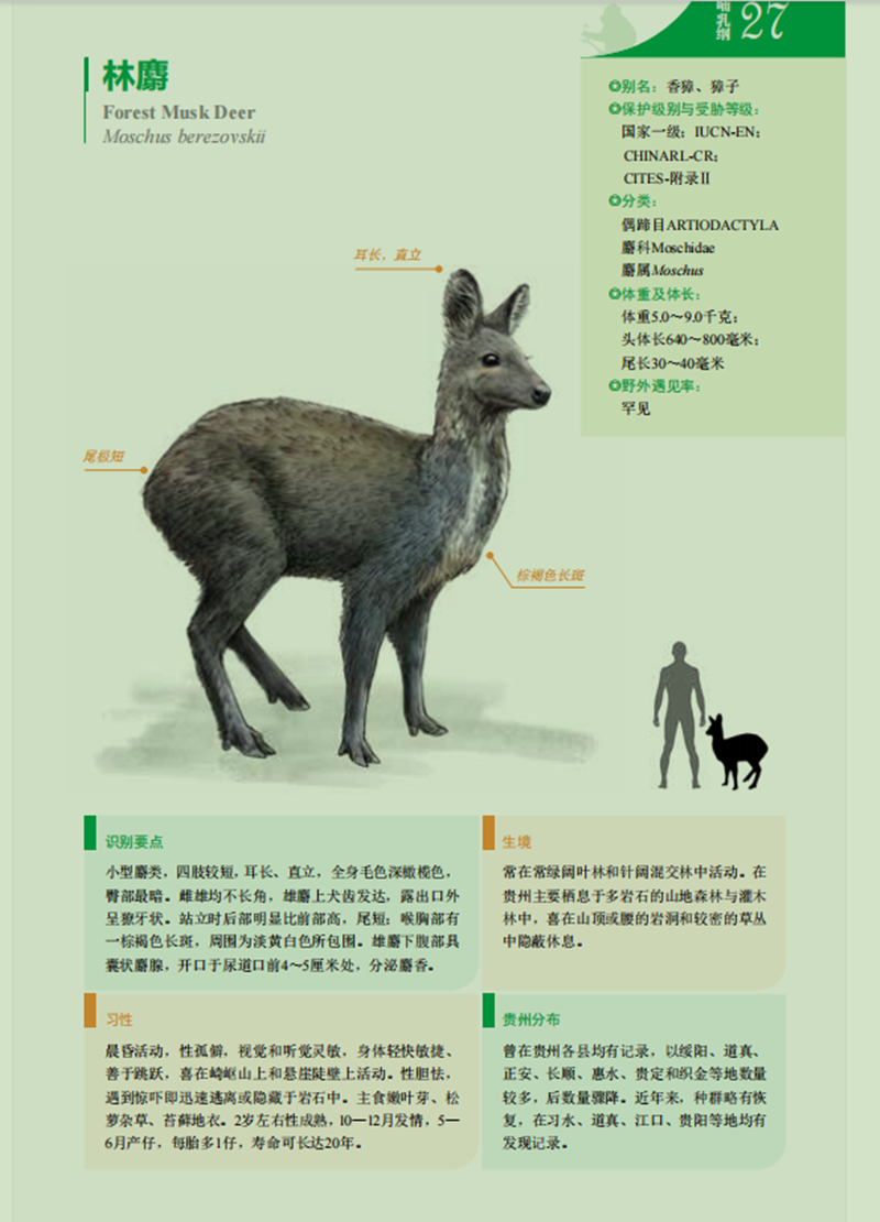 据悉,我国现有麝属(Moschus)物种6种,均为国家一级重点保护野生动物,而贵州仅有林麝分布。林麝野外遇见率极低、种群十分稀少,被世界自然保护联盟(IUCN)红色名录评定为濒危(EN)、中国生物多样性红色名录列为极危(CR),同时列入《濒危野生动植物种国际贸易公约》(CITES)附录Ⅱ。