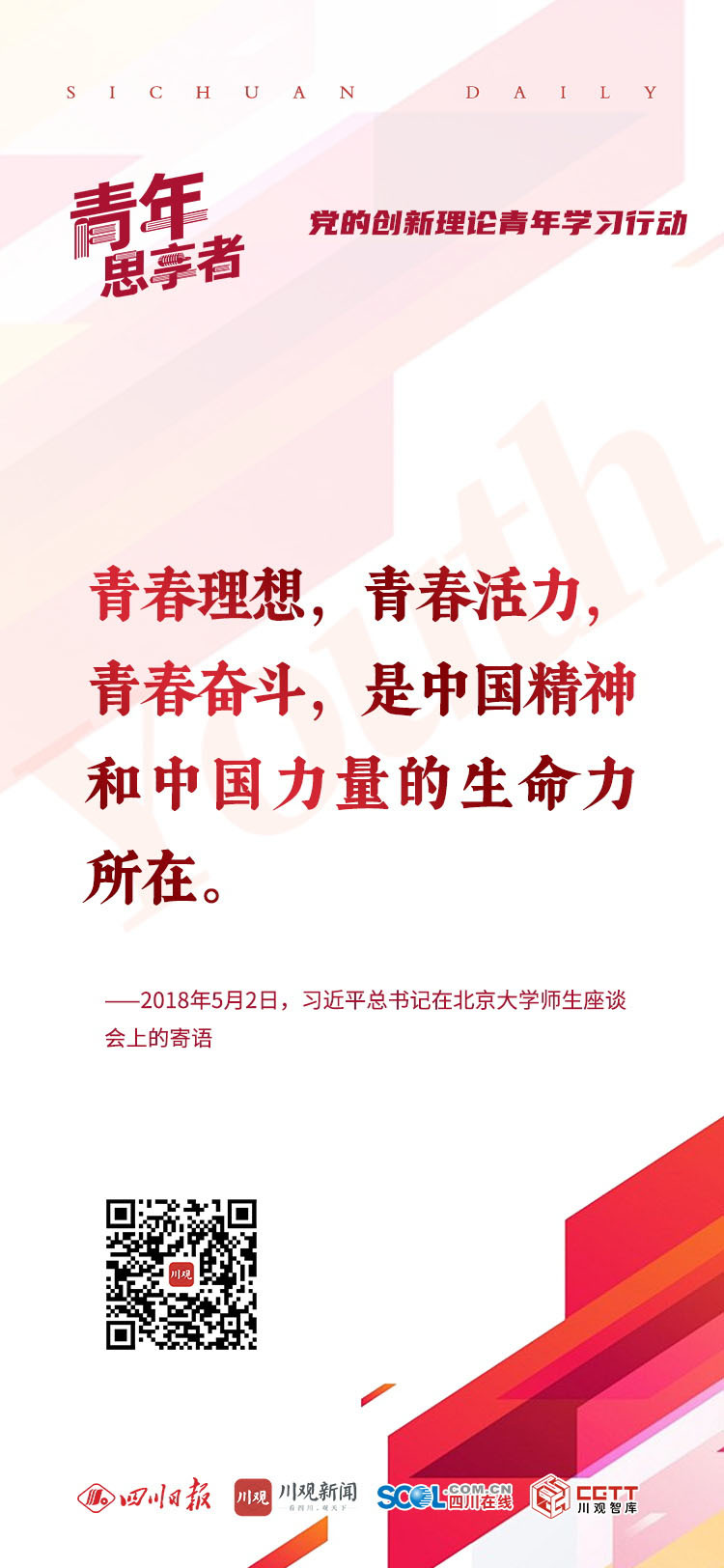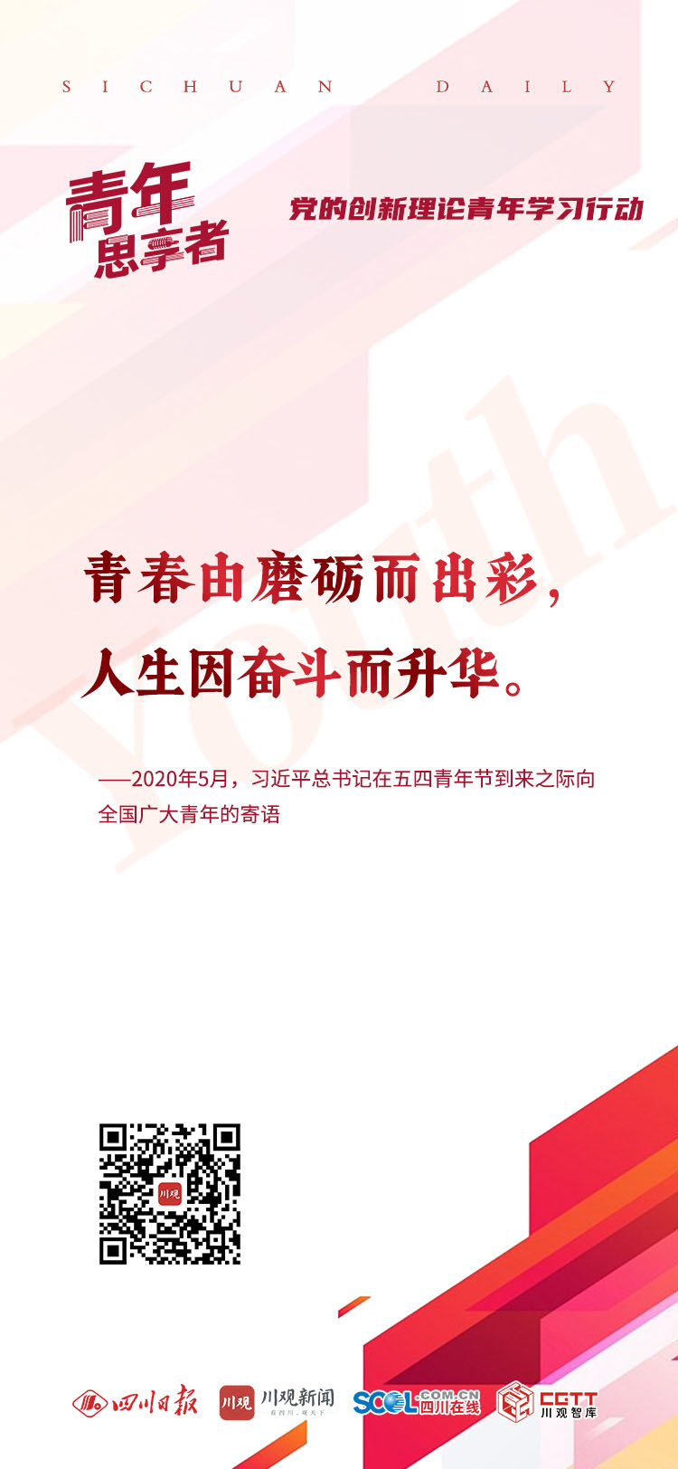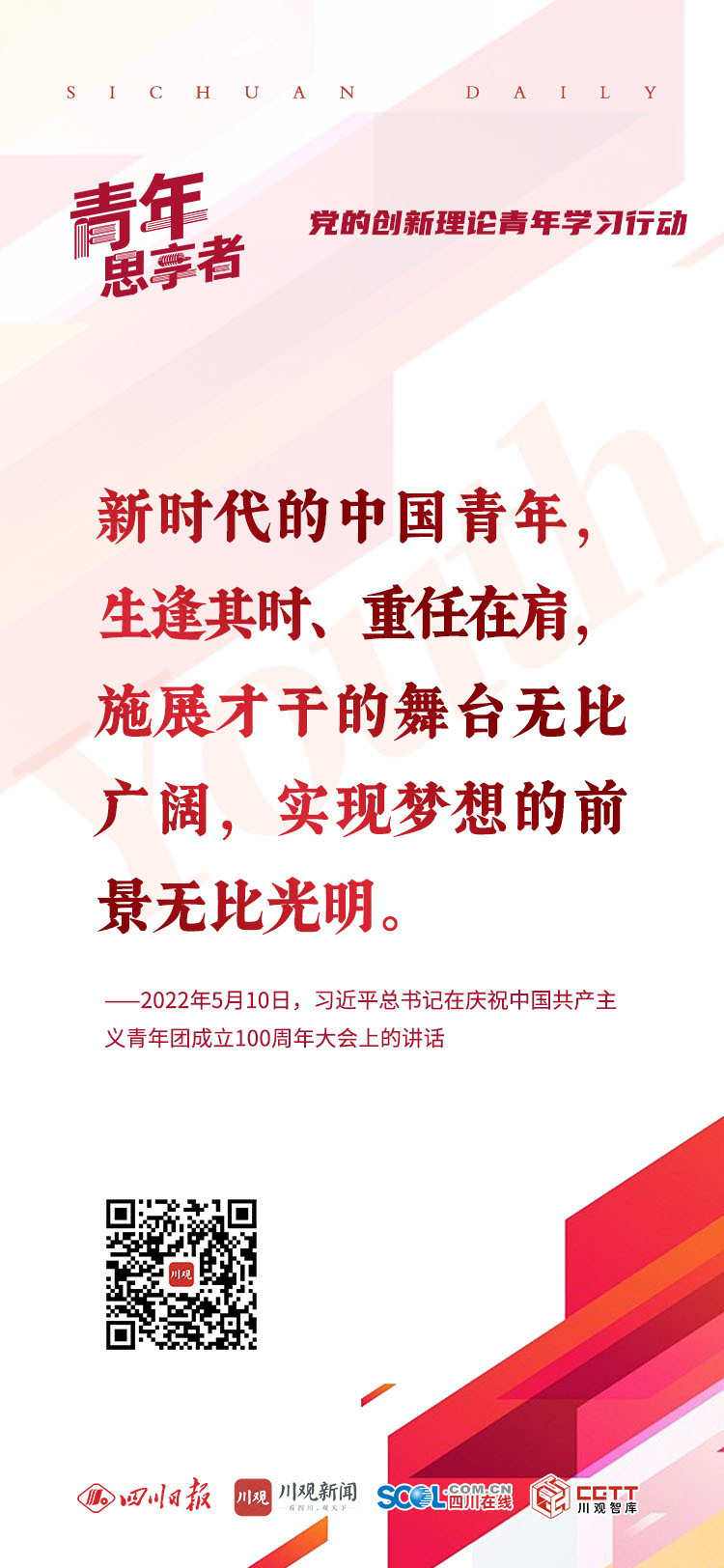 近期,由省委宣传部指导,省委教育工委、团省委、四川日报社主办的“‘青年思享者’——党的创新理论青年学习行动”已经火热开启。为了让更多小伙伴了解这个展现自我的舞台,我们准备了6张印有总书记对青年寄语的金句海报。哪一张正好戳中你?欢迎转发朋友圈,与朋友共勉。