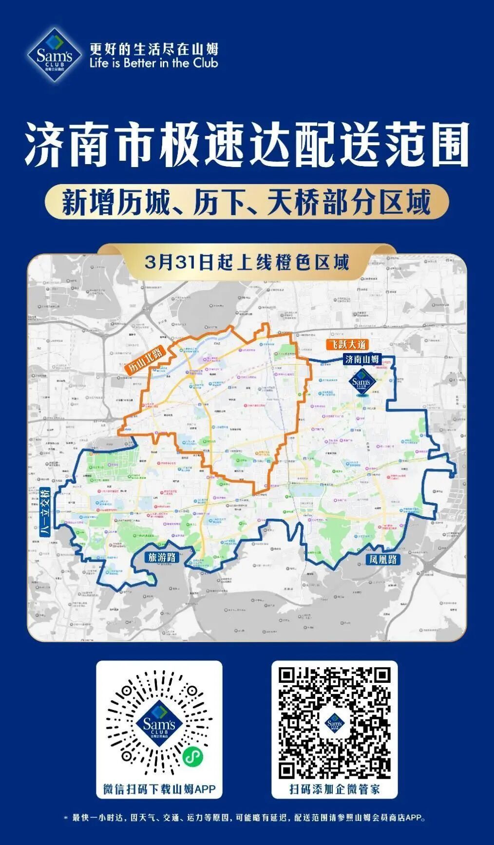 关于大家关心的极速达,3月31日起,继历下、市中和高新部分区域上线极速达服务后,历城、天桥部分区域正式被纳入配送范围。会员可通过山姆 App极速达下单,享受最快一小时送达的便捷购物体验。