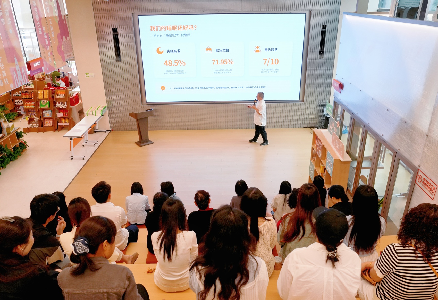 上午十点多钟,“中医芳疗·睡眠讲堂”刚开场,岐黄传承人张相星讲师一句“熬夜最伤肝,子时之前必须躺下”,台下的几位年轻人立刻推搡起正打哈欠的同伴:“听见没,说你呢!”哄笑声中,沉闷的周一早晨瞬间活泛。讲堂没有正襟危坐,讲师带着大家揉按太阳穴、练习呼吸,一套动作下来,不少人直呼“确实有困意了”。