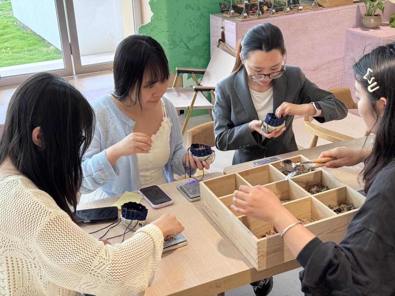 如果说上午的讲座是“醒脑风暴”,下午的香囊制作就是“治愈手作”。在新中式香疗体验区,长桌上摆满艾草、决明子等各类草药、精油和绸布袋,参与者跟随芳疗师李婷,将草药与彭州本地天府香疗研究院出品的伴月香精油按比例调配,再亲手缝进香囊。